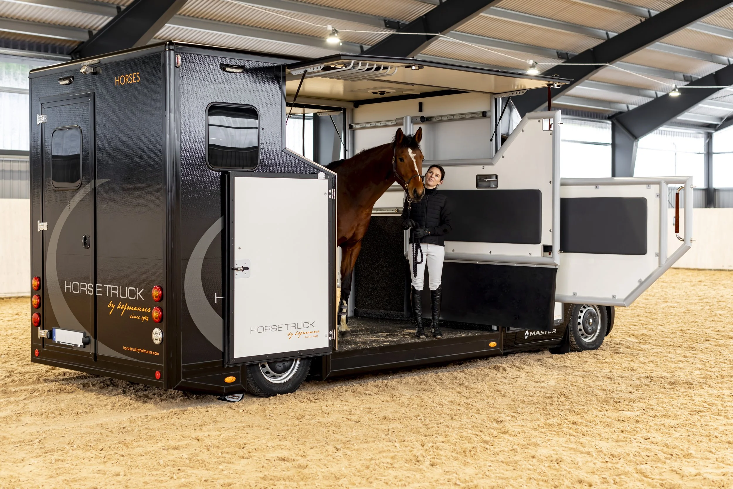 En hästtransport med unika egenskaper. Bilen sänks ned för i och urlastning och ger ett lågt insteg samt att bilen kan öppnas från två håll.